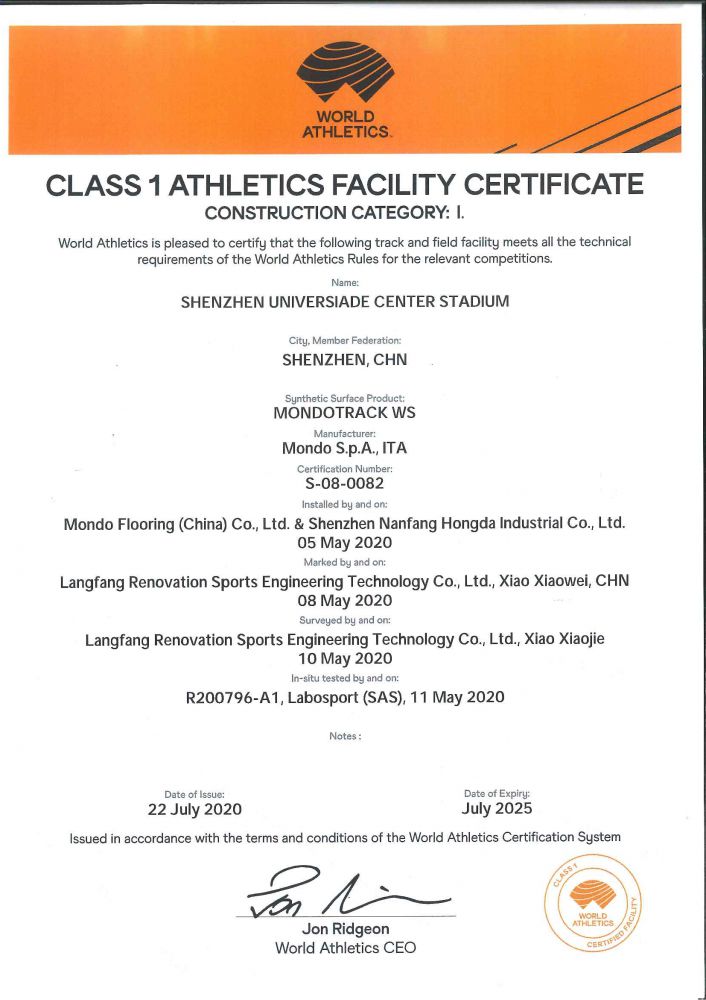 本项目位于深圳市龙岗区大运体育中心,场内为比赛用400米专业田径场,面层采用目前最先进的预制型塑胶跑道系统,场地已经通过世界田径协会一级场地认证。